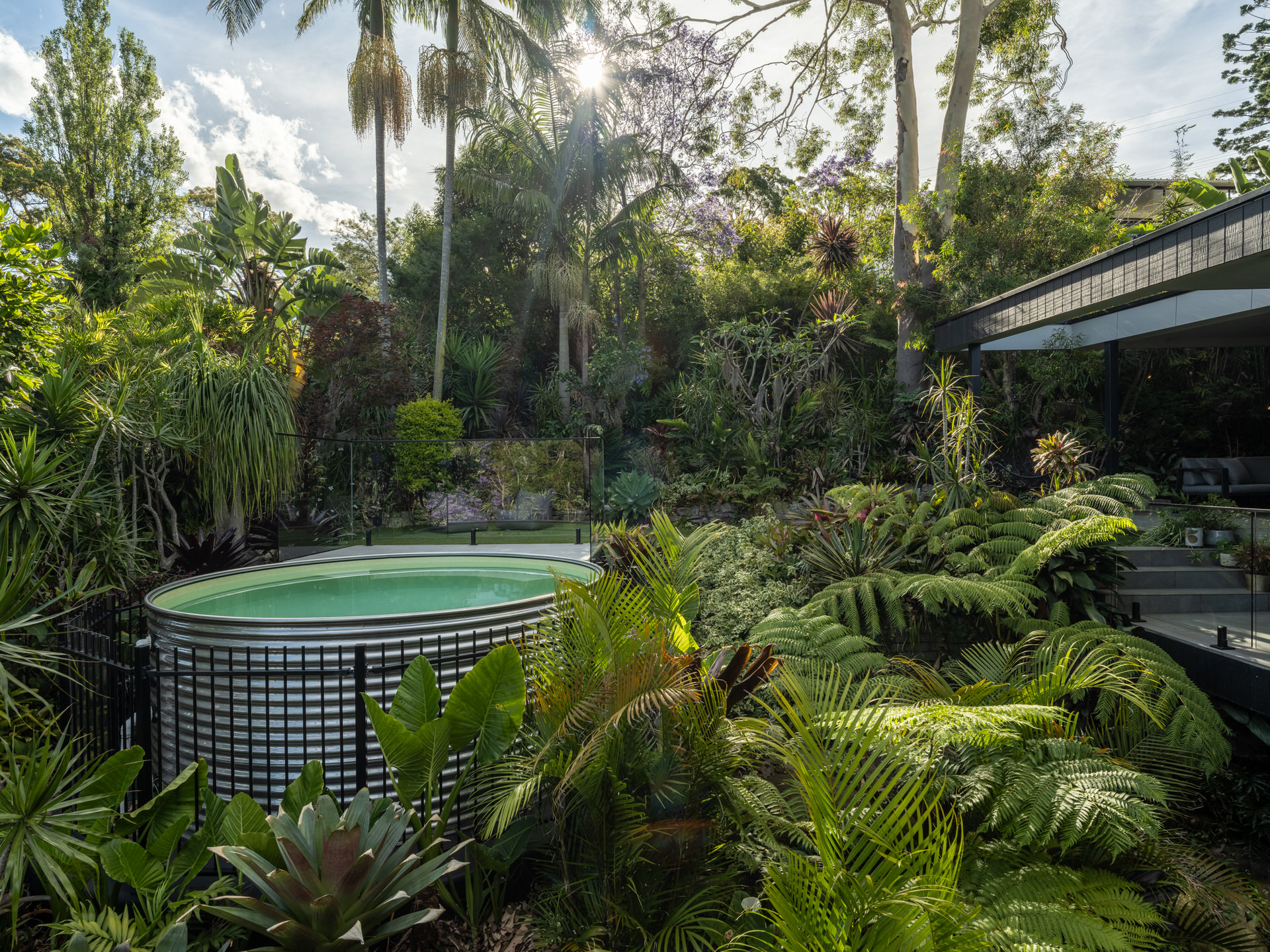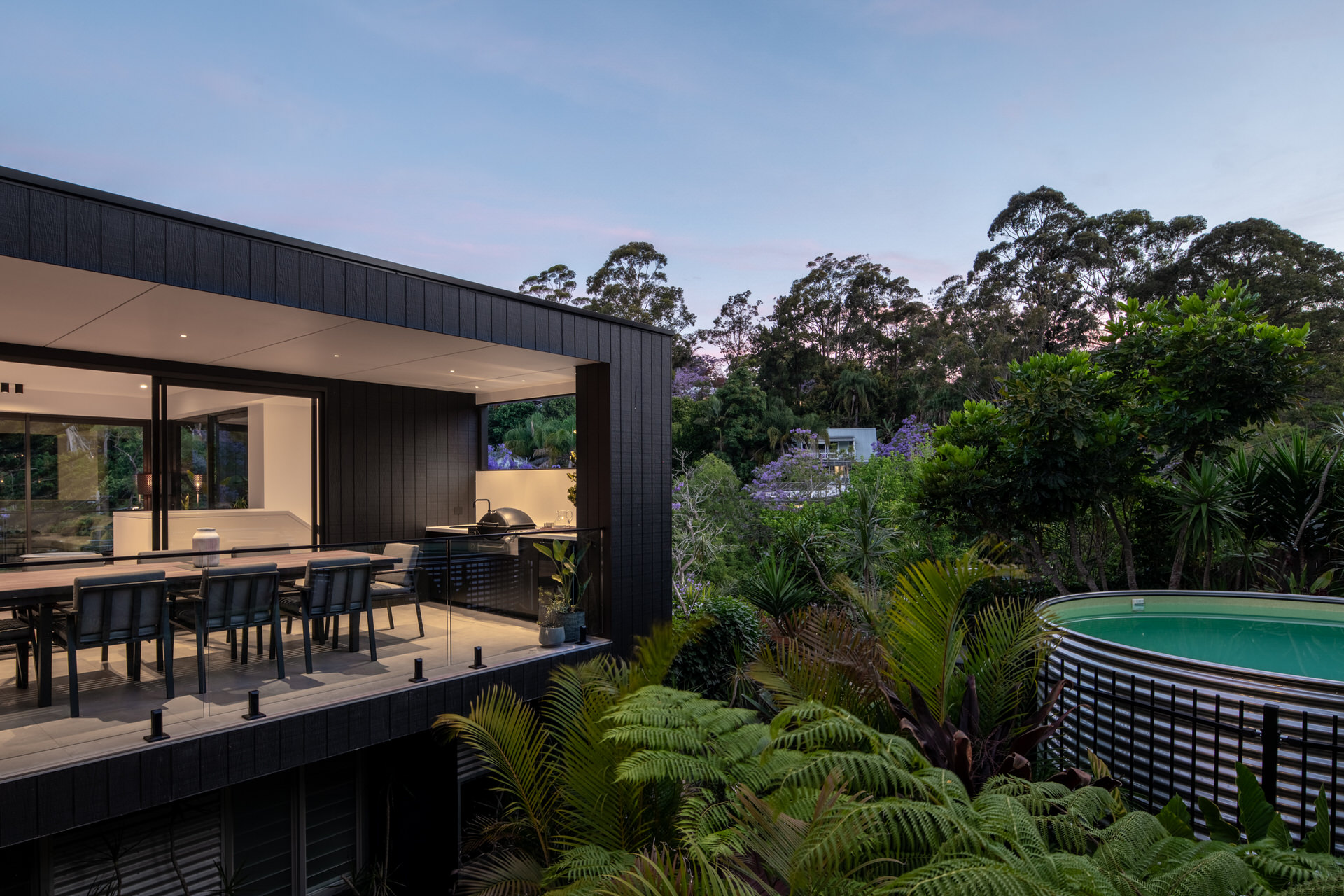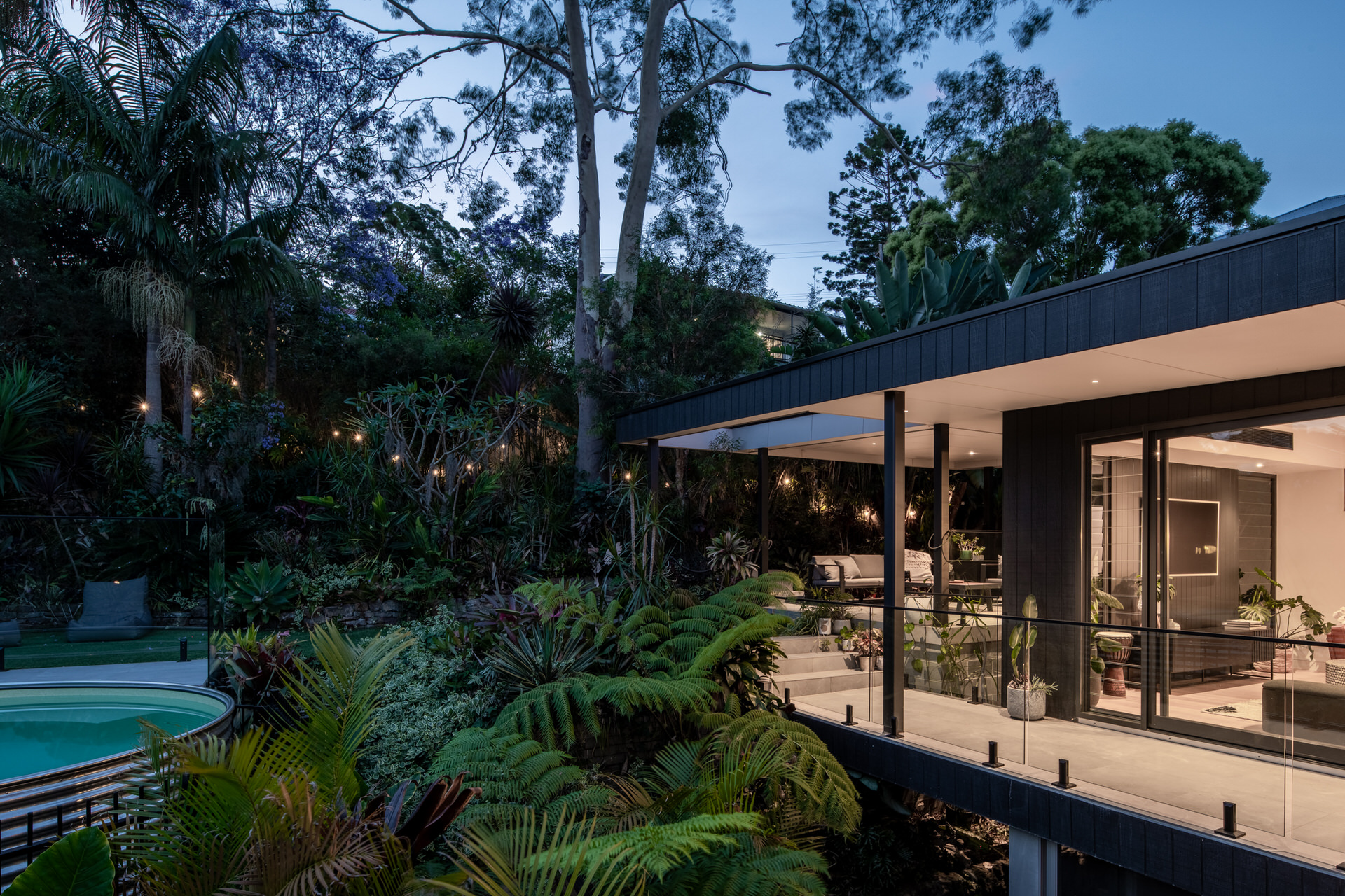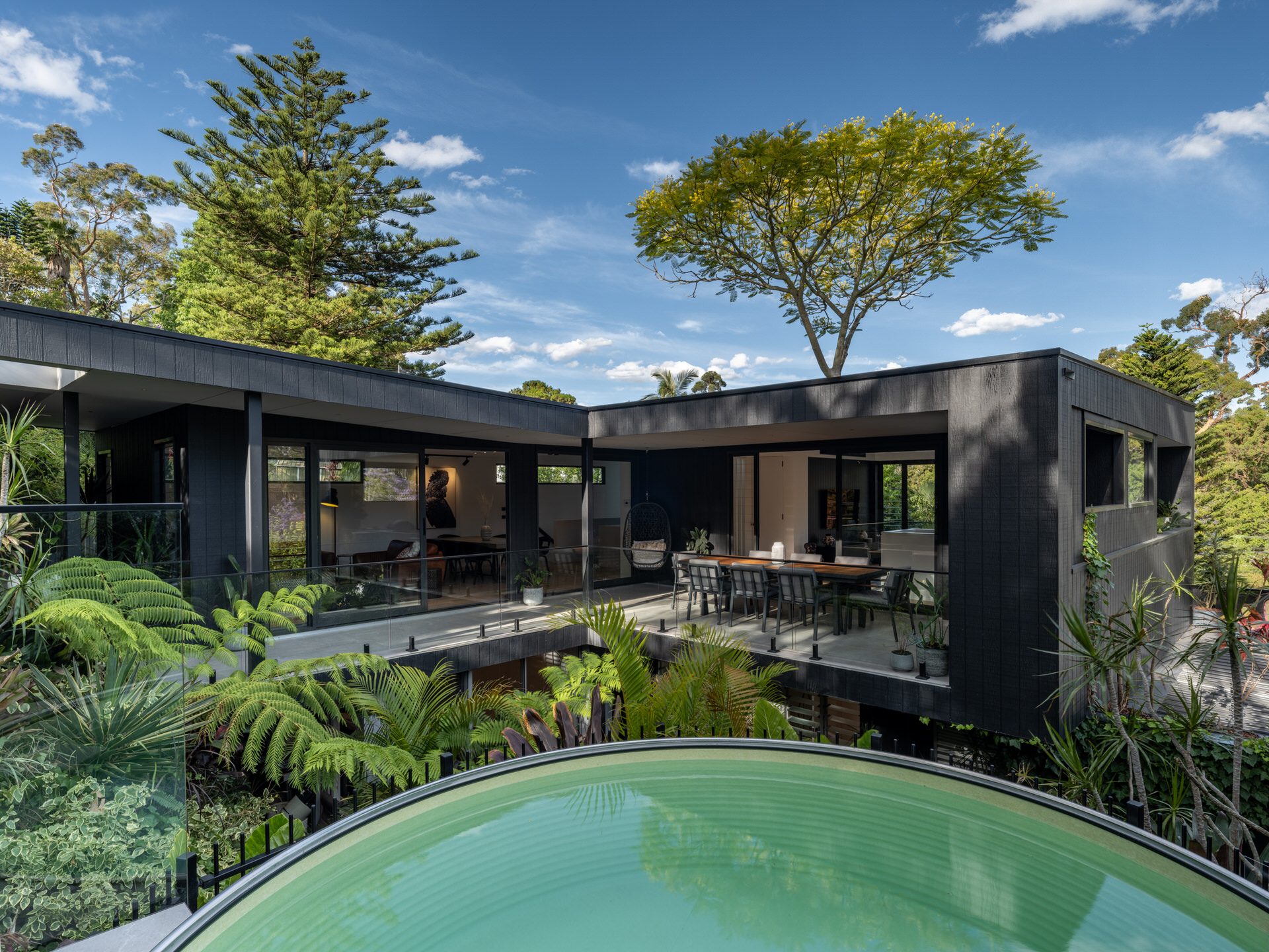 A first-floor addition elevates living spaces to fully connect with the lush rear garden. Open- plan living, dining and media areas open to terraces, linking seamlessly to the circular feature plunge pool and landscaped gardens, making entertaining effortless. The lower level accommodates additional bedrooms and a retreat-like master suite opening onto a private shady and fern-filled courtyard. Charcoal cladding and a butterfly roof provide a contemporary, refined presence that complements the natural leafy setting and enhances indoor–outdoor living.