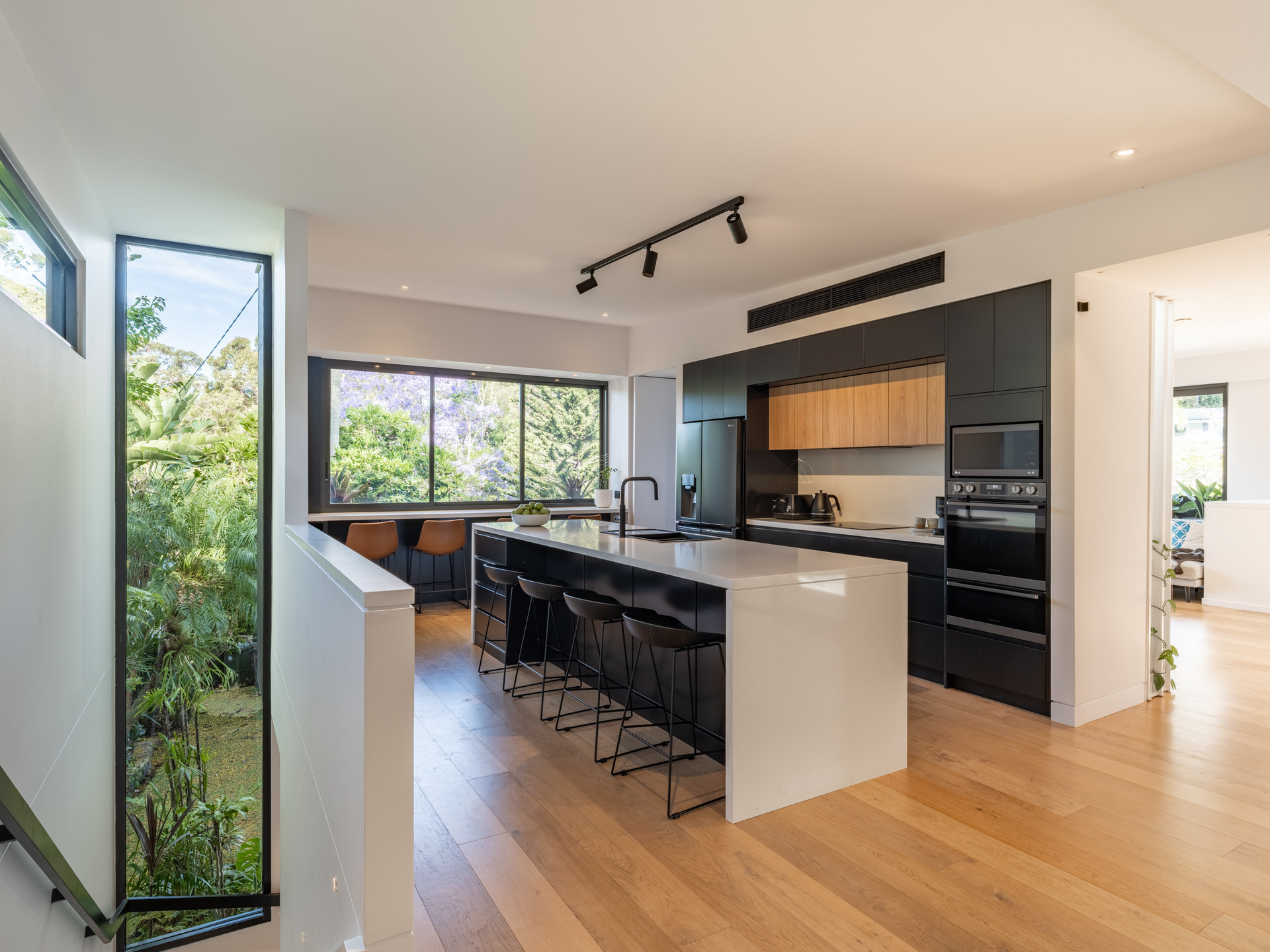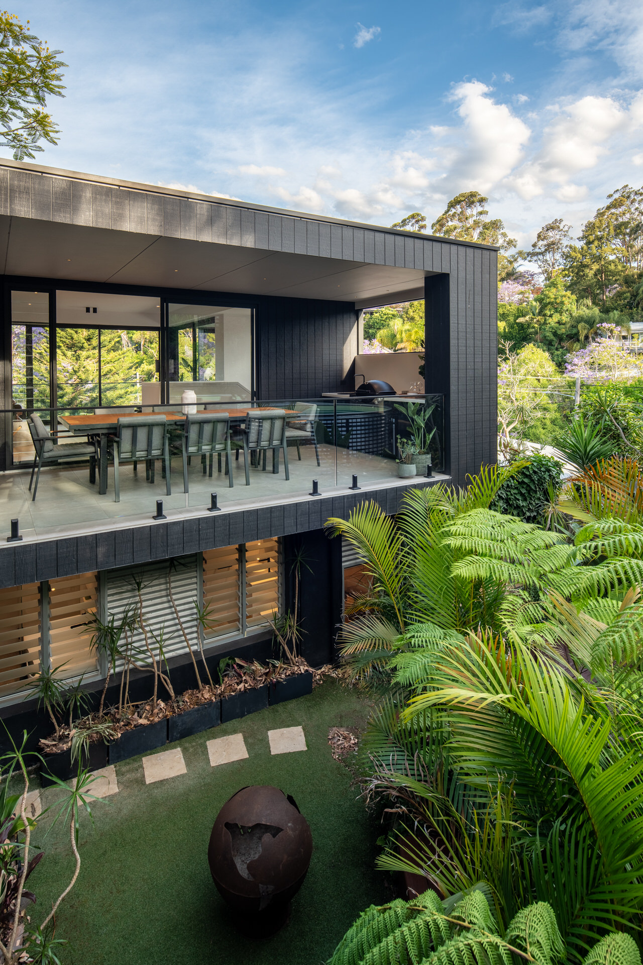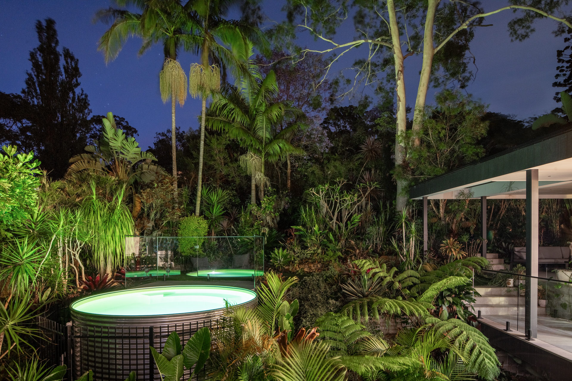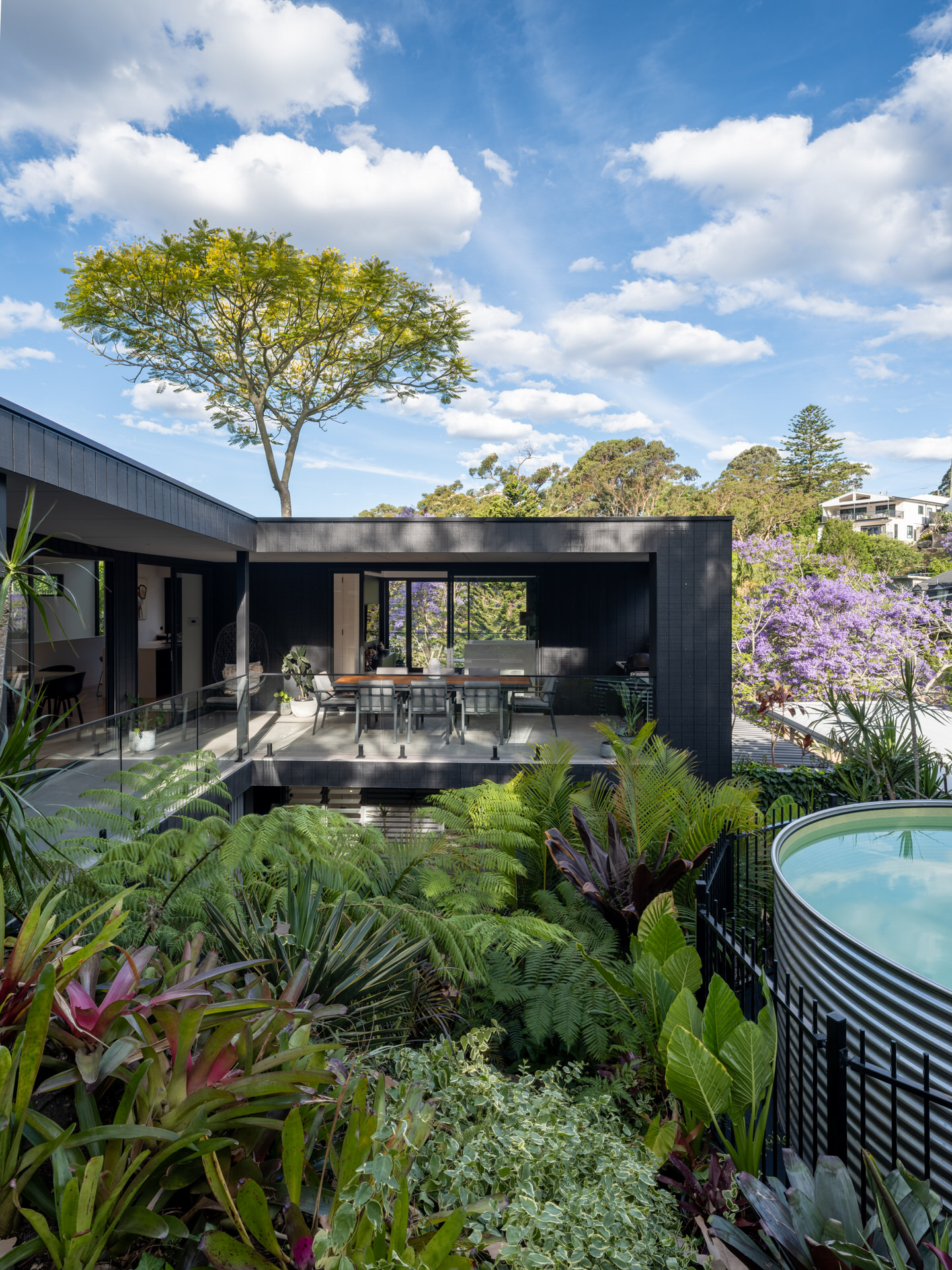 A first-floor addition elevates living spaces to fully connect with the lush rear garden. Open- plan living, dining and media areas open to terraces, linking seamlessly to the circular feature plunge pool and landscaped gardens, making entertaining effortless. The lower level accommodates additional bedrooms and a retreat-like master suite opening onto a private shady and fern-filled courtyard. Charcoal cladding and a butterfly roof provide a contemporary, refined presence that complements the natural leafy setting and enhances indoor–outdoor living.
