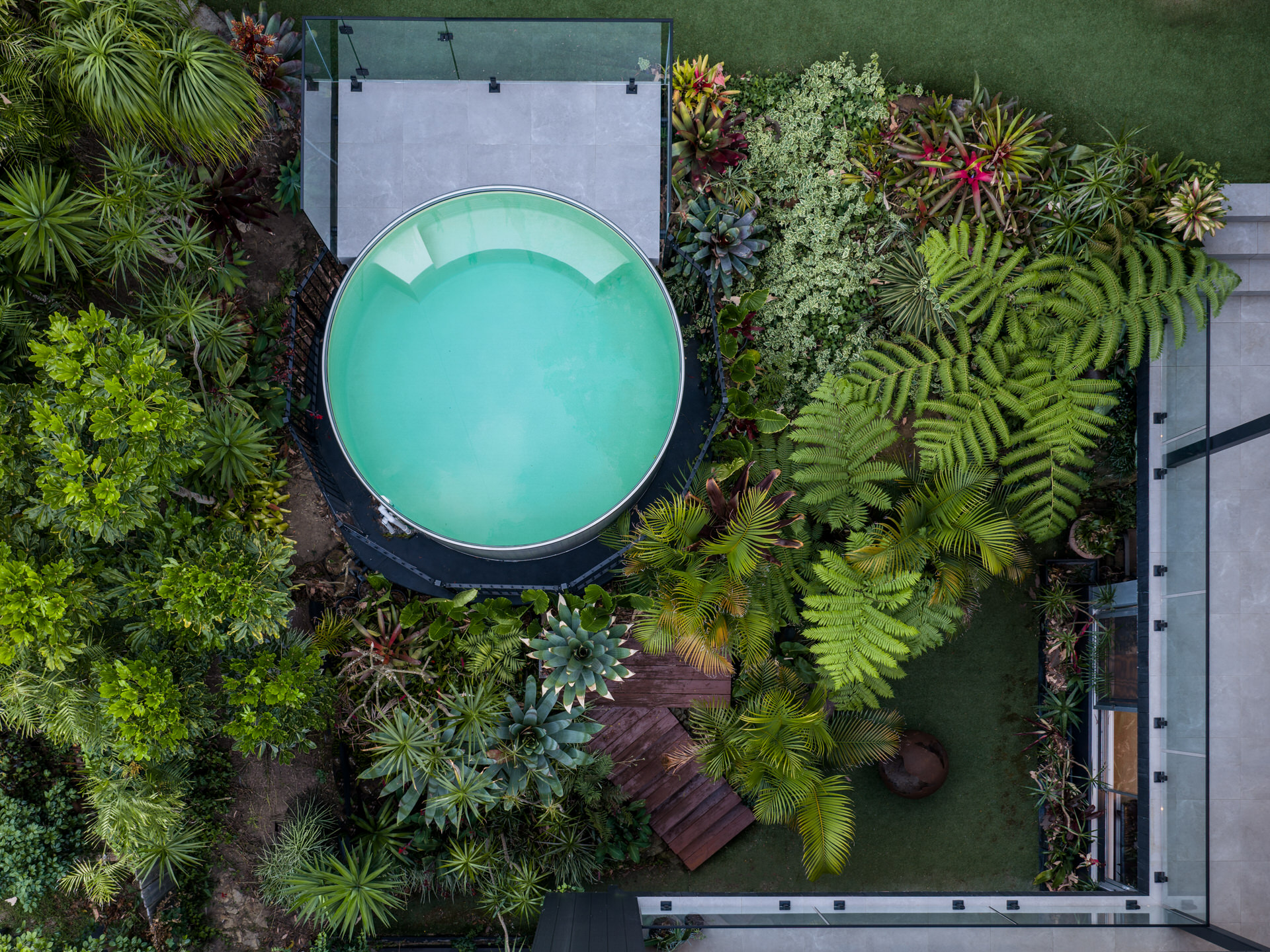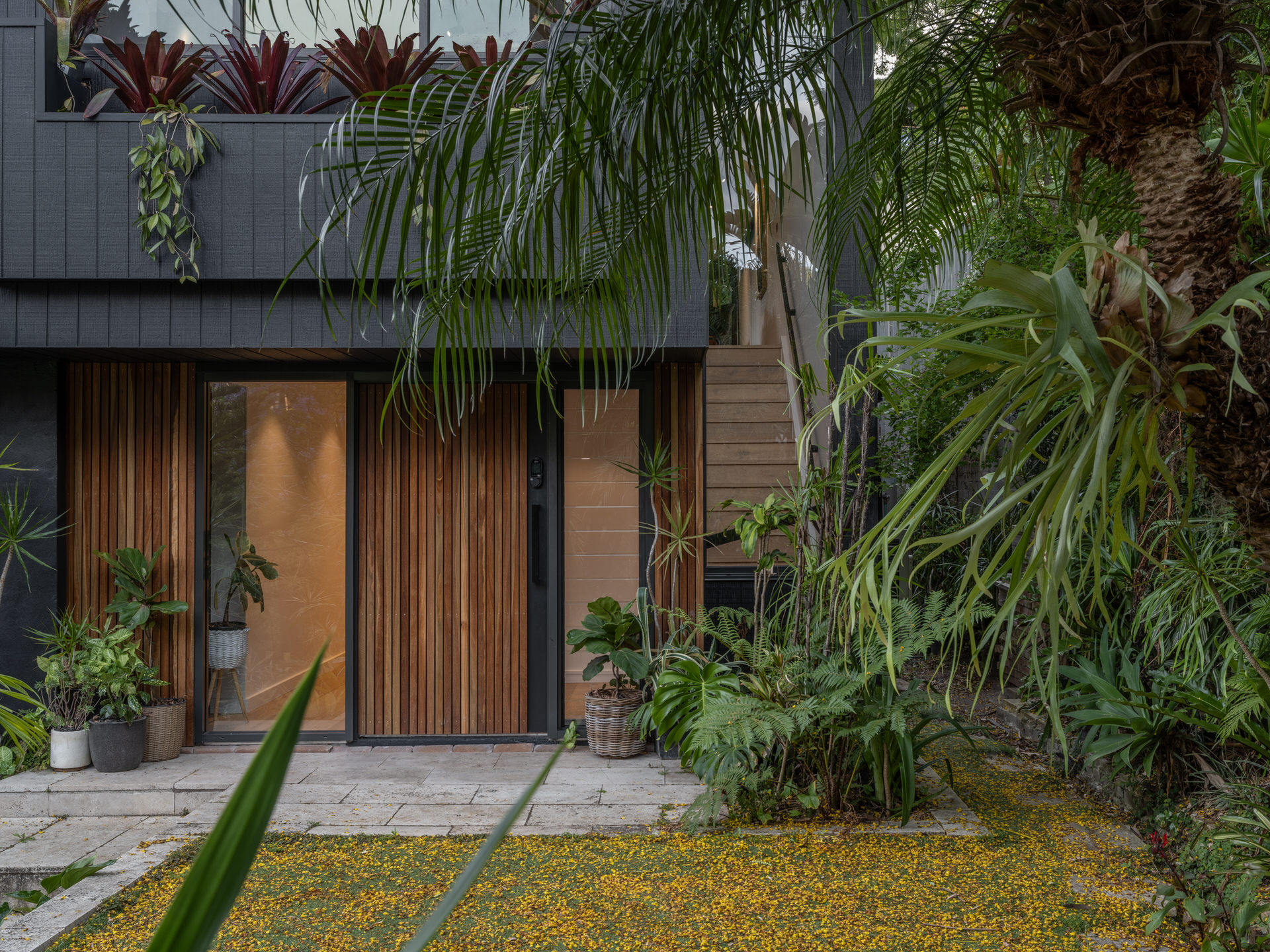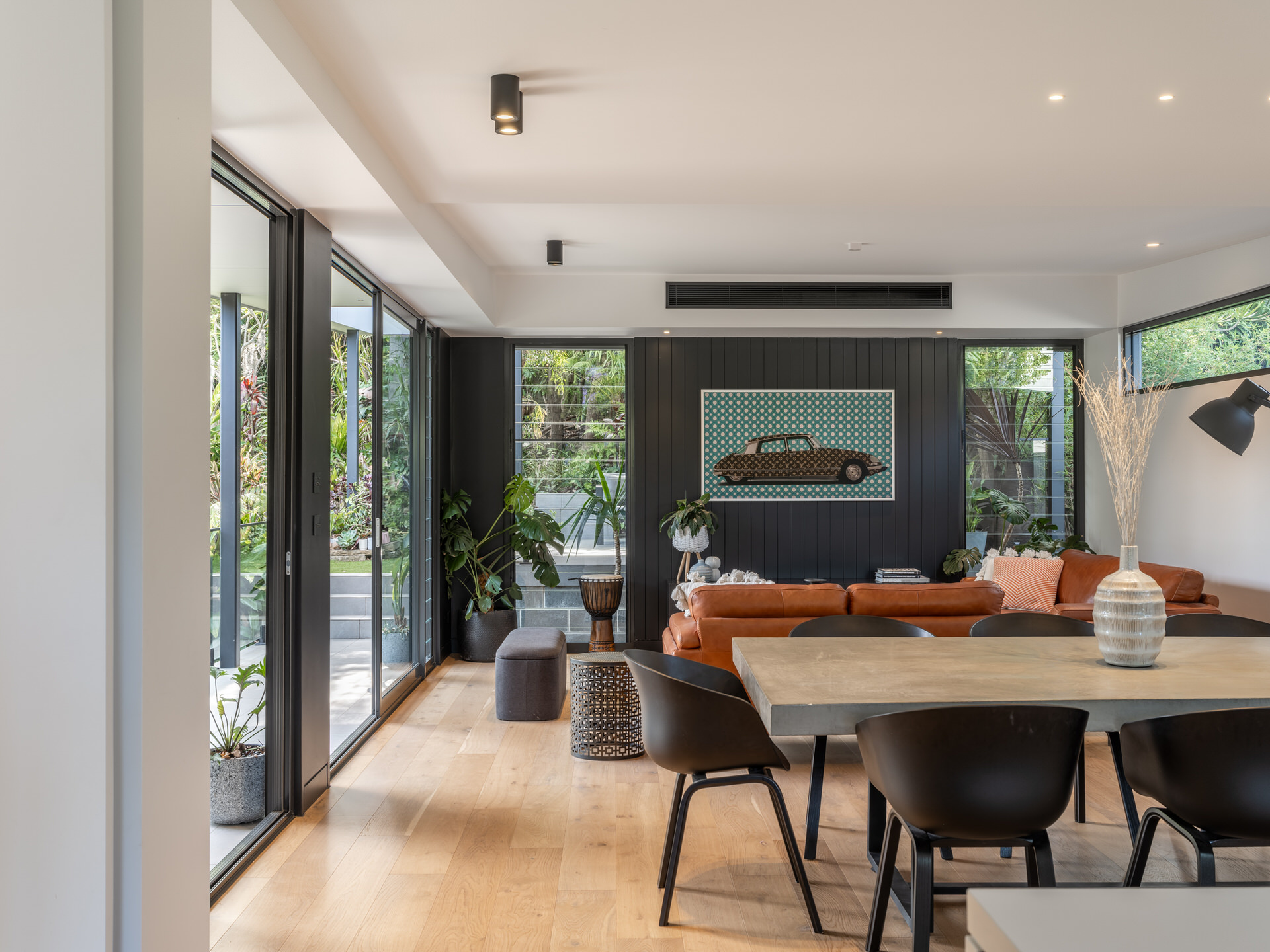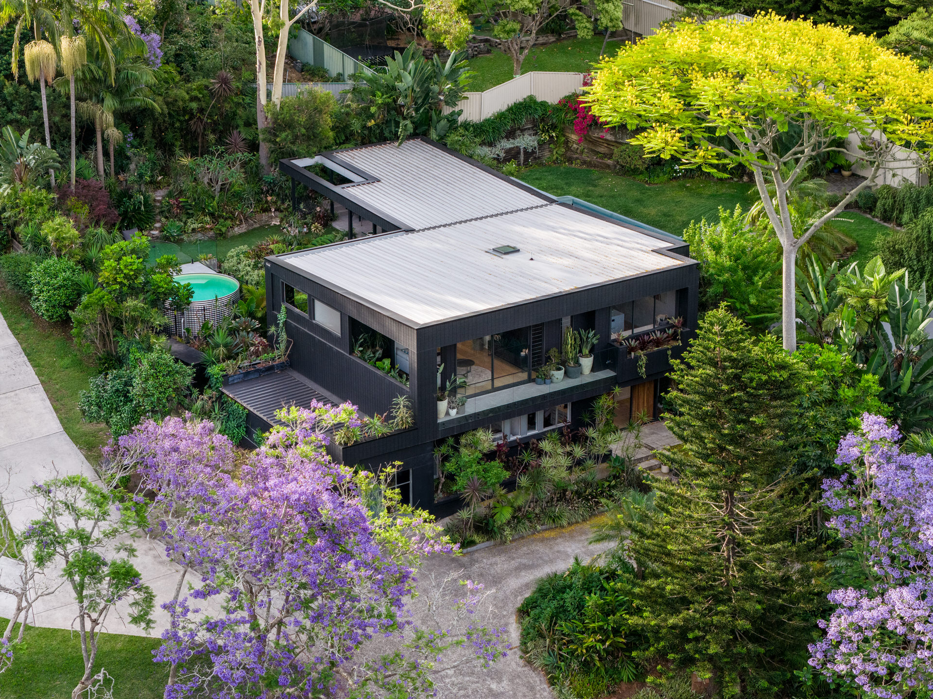 A first-floor addition elevates living spaces to fully connect with the lush rear garden. Open- plan living, dining and media areas open to terraces, linking seamlessly to the circular feature plunge pool and landscaped gardens, making entertaining effortless. The lower level accommodates additional bedrooms and a retreat-like master suite opening onto a private shady and fern-filled courtyard. Charcoal cladding and a butterfly roof provide a contemporary, refined presence that complements the natural leafy setting and enhances indoor–outdoor living.