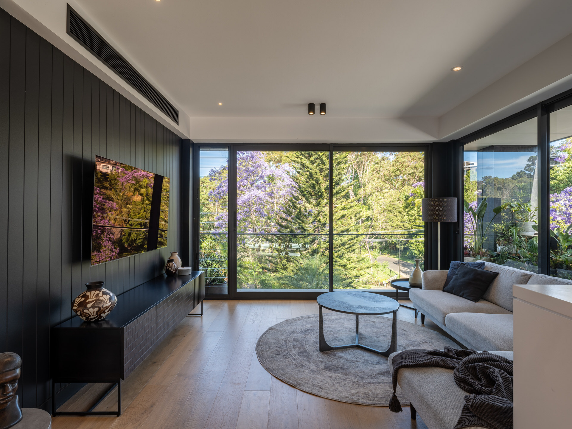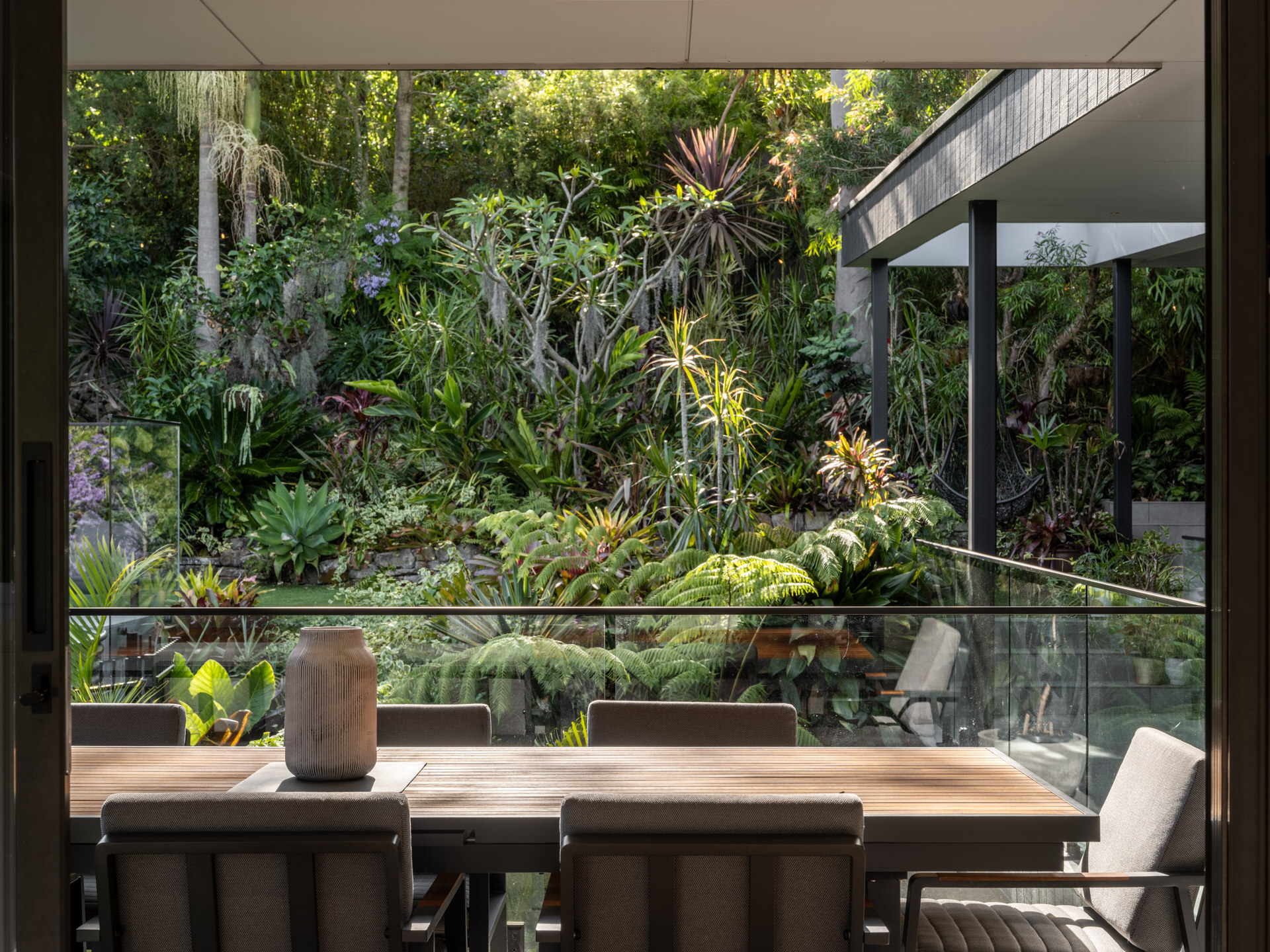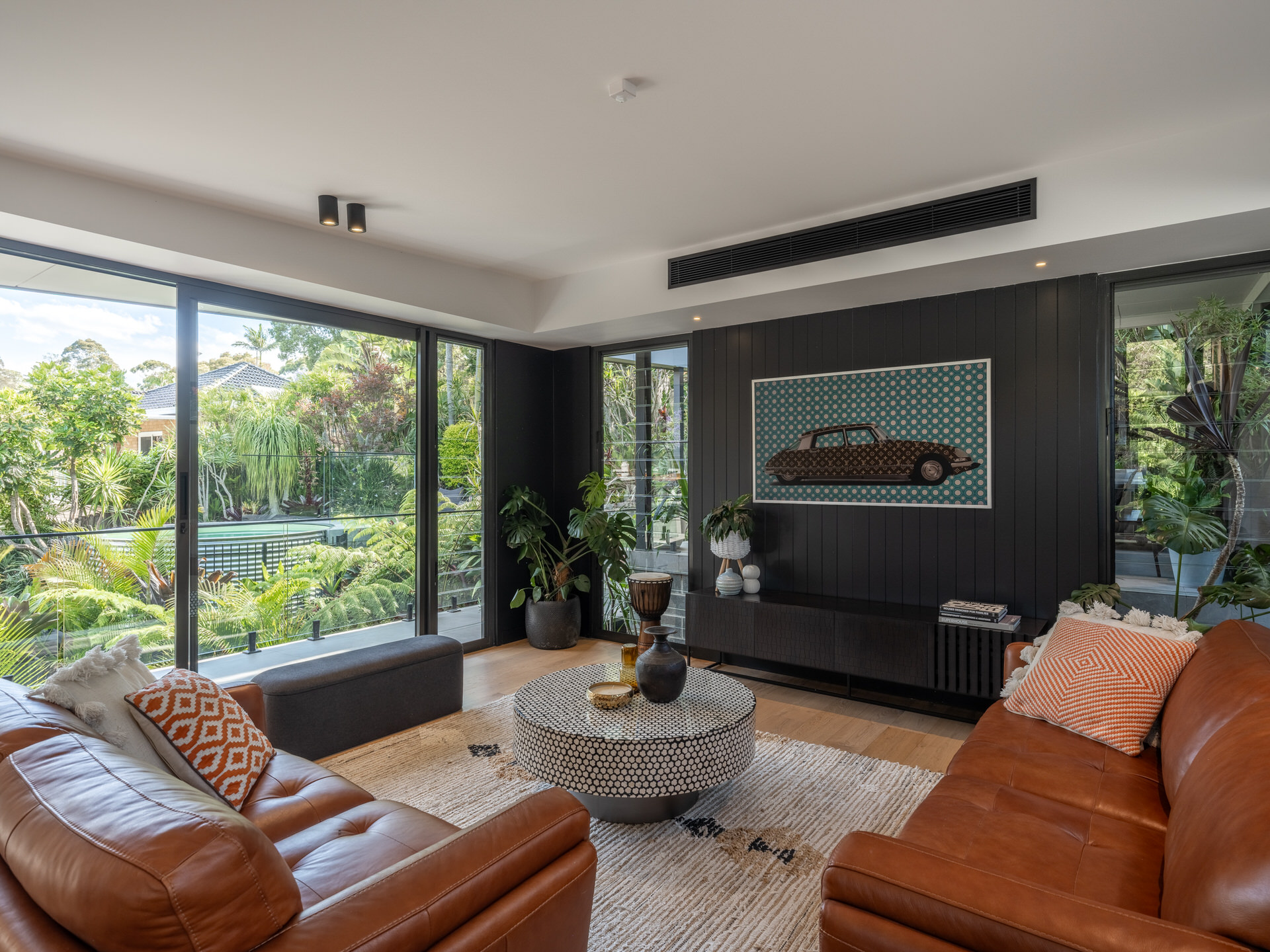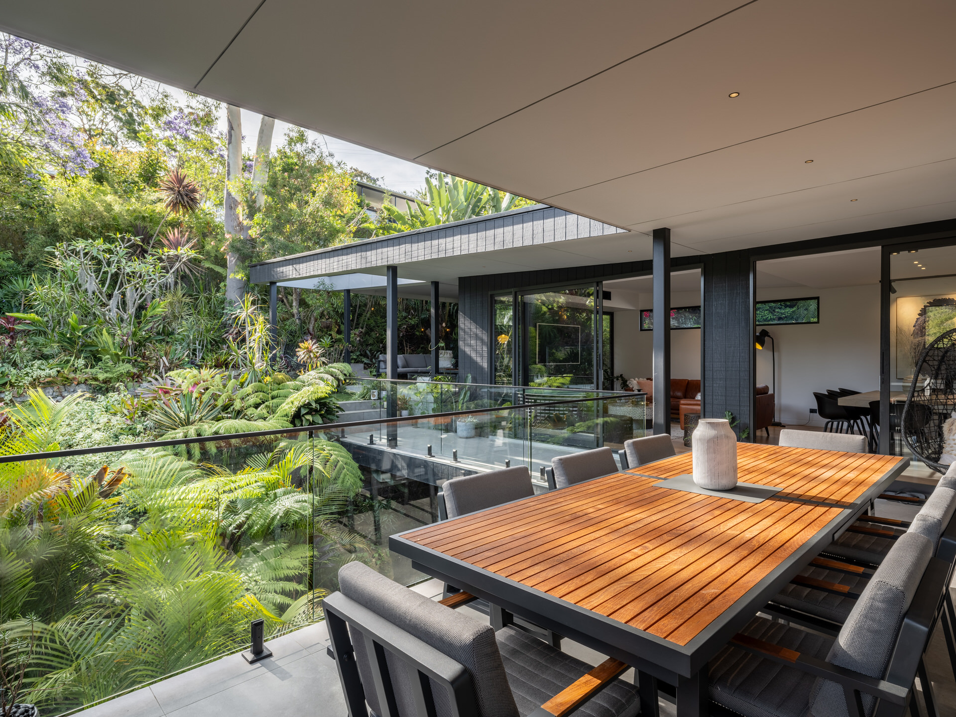A first-floor addition elevates living spaces to fully connect with the lush rear garden. Open- plan living, dining and media areas open to terraces, linking seamlessly to the circular feature plunge pool and landscaped gardens, making entertaining effortless. The lower level accommodates additional bedrooms and a retreat-like master suite opening onto a private shady and fern-filled courtyard. Charcoal cladding and a butterfly roof provide a contemporary, refined presence that complements the natural leafy setting and enhances indoor–outdoor living.